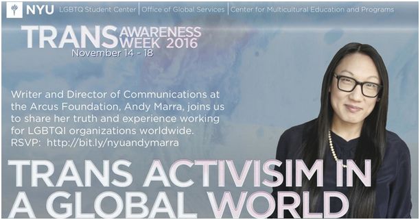 Featured in The Advocate’s “Forty Under 40,” and listed as one of The Huffington Post’s “Most Compelling LGBT People,” writer and advocate, Andy Marra, joins us to share her truth and experience working for LGBTQI organizations worldwide! Born in Seoul, Korea and adopted by US parents at six months old Andy’s life journey has taken her from working as a student organizer at GLSEN to co-director of the Korean organization, 노둣돌 (Nodutdol), to Director of Communications at the Arcus Foundation. With over 15 years of communication and advocacy experience, Andy Marra will share her perspective on the struggles of an intersectional transgender community in a national and global context while providing insight into ways we can move forward as a coalition. Join us for an engaging night of solidarity, education, and inspiration.