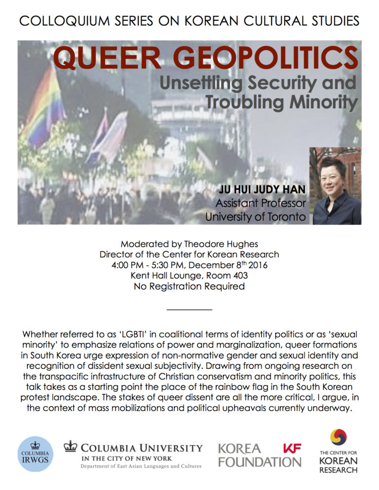 Whether referred to as ‘LGBTI’ in coalitional terms of identity politics or as ‘sexual minority’ to emphasize relations of power and marginalization, queer formations in South Korea urge expression of non-normative gender and sexual identity and recognition of dissident sexual subjectivity. In recent years, queer critique has challenged masculinist labour movements and heteronormative women’s movements, troubling militarism and ableism and becoming more legible in the broad social movement landscape. Taking place at the same time, however, is the emergence of intensified bigotry in the political sphere and the persistence of institutional heterosexism, most prominently represented by the conservative Protestant-led opposition to anti-discrimination policies in the name of geopolitical security and a ‘moral majority.’ Drawing from ongoing research on the transpacific infrastructure of Christian conservatism and minority discourse, this talk takes as a starting point the place of the rainbow flag in the South Korean protest landscape. The stakes of queer dissent and minority politics are all the more critical, I argue, in the context of mass mobilizations and political upheavals currently underway.