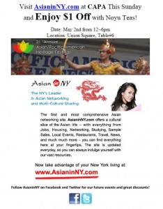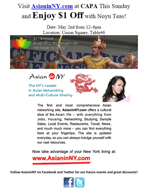 Sign up with your email at the AsianinNY.com table ( #6 ), you can enjoy $1 off the amazing tasty NoYu Teas. We look forward to seeing you this Sunday!