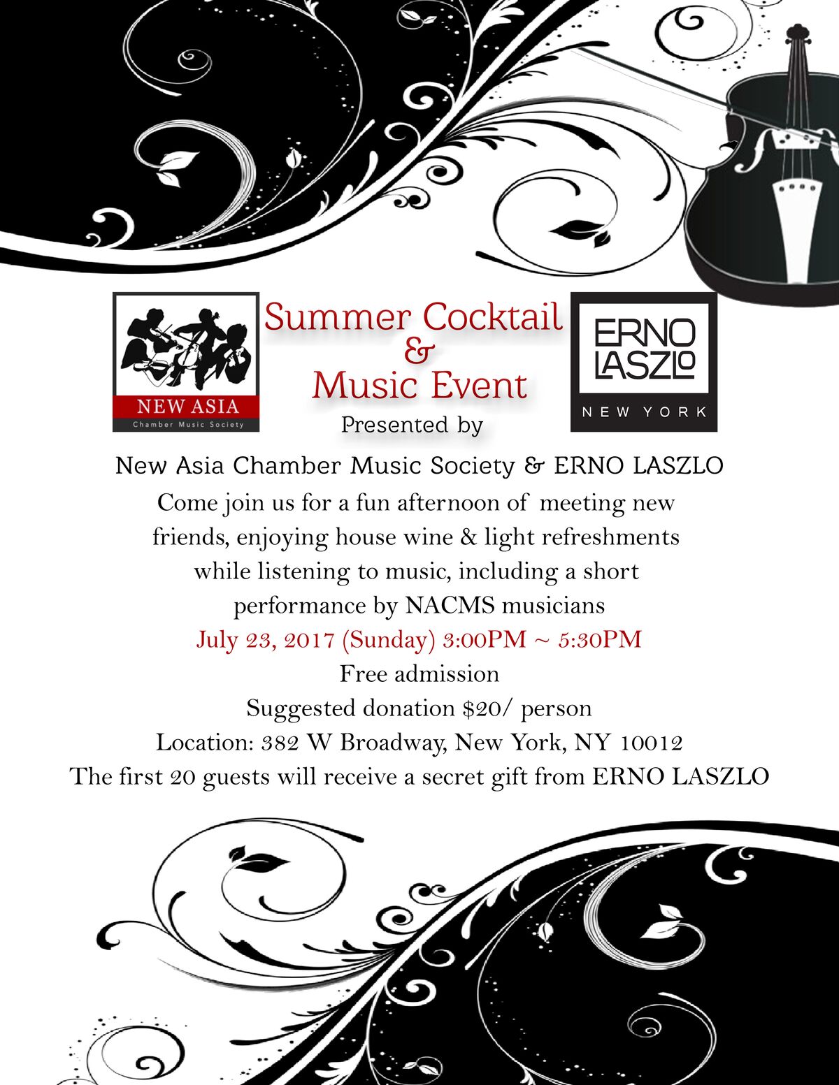 Join New Asia Chamber Music Society’s Summer Cocktail & Music Event at a beautiful space provided by Erno Laszlo. Please come to join us for a fun afternoon of meeting new friends, enjoying house wine and light refreshments. NACMS artists will also present a few short live performances for you to have a close engagement with the artists and instruments. Please come early as Erno Laszlo has graciously offer the first 20 guests to receive a secret gift!! We ask for a humble suggested donation of $20, and each $10 donation will entitle to a raffle ticket to win some special prizes provided by our sponsors.