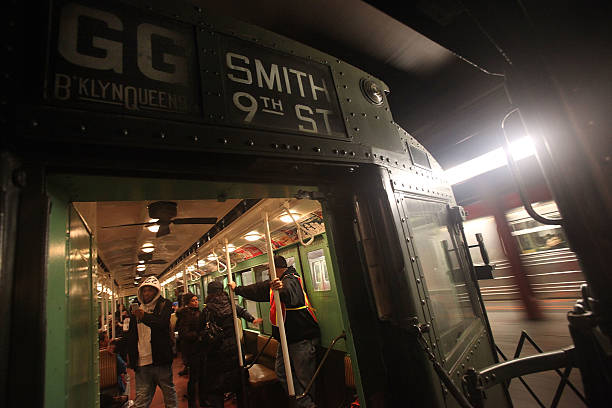 The special eight-car subway train of R1-9 cars from the 1930s is complete with rattan seats, ceiling fans, incandescent bulb lighting, drop-sash style windows, vintage roll signs, and original advertisements.