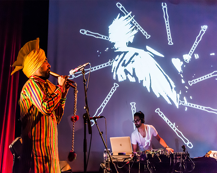 Mixing live electronic dance music with Punjabi dhol drums, vocals, stringed instruments, and the hypnotic sounding double flute algoza, the powerful, distinct rhythms and traditional melodies of the Punjab will interact creatively with live electronic drum machines, synthesizer arpeggios, and basslines. Visual projections of original digital animations and cinematic Punjabi imagery, produced by filmmaker John Minton, will complete a unique musical and visual event.