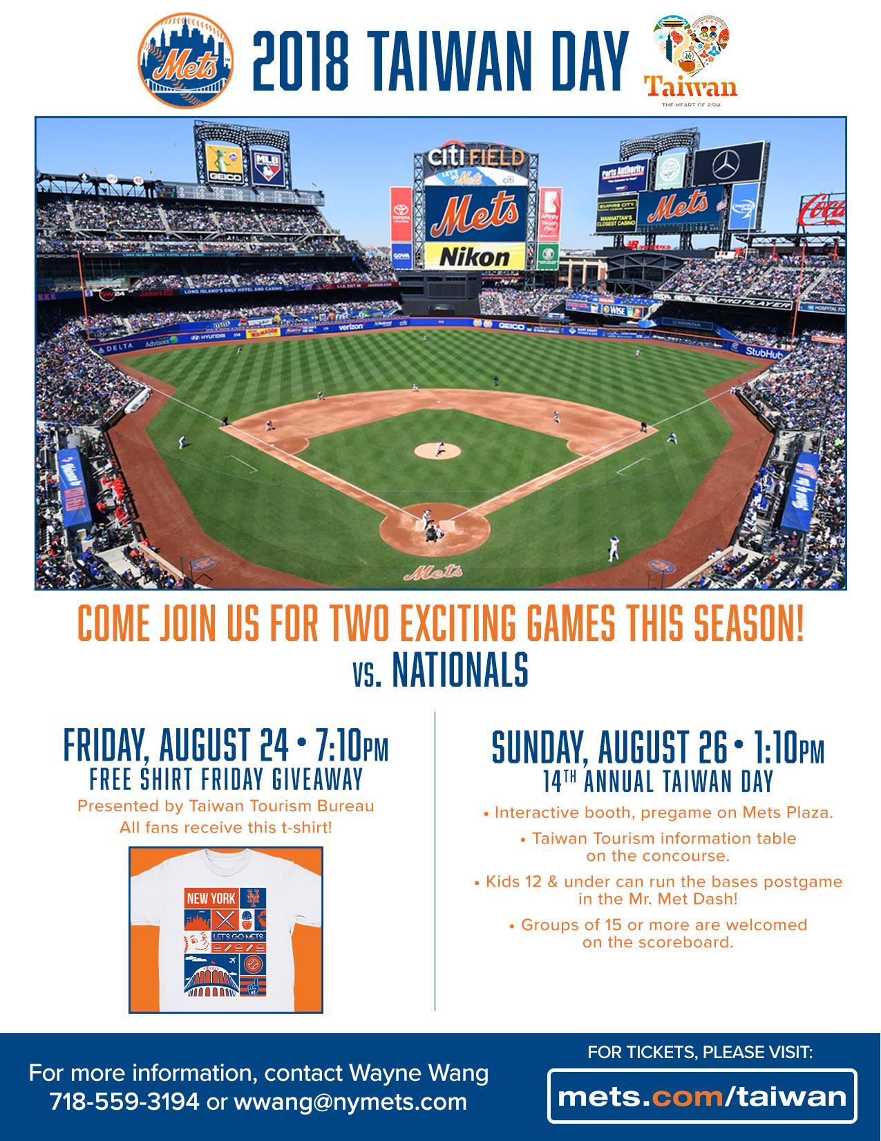 Come join the New York Mets and Tour Taiwan – TTB America Taiwan Tourism Bureau on Sunday, August 26 to celebrate our 14th annual Taiwan Day at Citi Field! Visit the Taiwan Tourism interactive booth, along with other family activates on Mets Plaza, pre-game starts from 11 am. We will announce more detail regarding performances and special guests in the following weeks, for more information and to get tickets, please visit mets.com/Taiwan