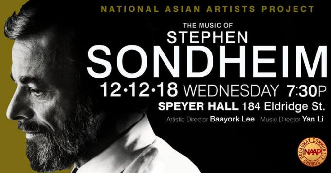 National Asian Artists Project Broadway Community Chorus presents its annual Fall concert showcasing the music of legendary Broadway composer Stephen Sondheim. The 30 plus member chorus, music directed by Yan Li, will be joined by guest artists EJ Zimmerman and Steven Eng in an exciting musical evening showcasing music from classic musicals including West Side Story, Follies, Assassins, Into the Woods, Sunday in the Park with George, and much much more!