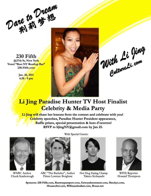 Li Jing will have a final interview with the President of Paradise Hunter, Dennis Kambeitz. The event will be held on January 26, 2011 from 6:30 to 9pm at famous New York City rooftop bar 230 5th on 27th Street and Fifth Avenue. Celebrities and guests will help create a “Dream Book” at the event by writing down their favorite inspirational quote.